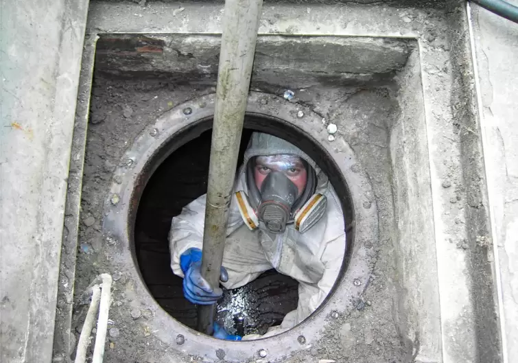 Wanneer we een zware stookolietank reinigen, al dan niet met de bedoeling dat we ze nadien afbreken, controleren we eerst hoeveel product er nog in de tank zit. We openen het mangatdeksel in de wand of we maken - indien de zware stookolie te hoog staat - een opening boven het vloeistofniveau.
